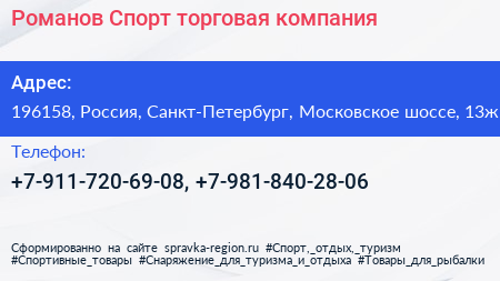 Романов Спорт, торговая компания по адресу 196158, Россия, Санкт-Петербург, Московское шоссе, 13ж в дальнейшем Организация, размещена в следующих категориях: