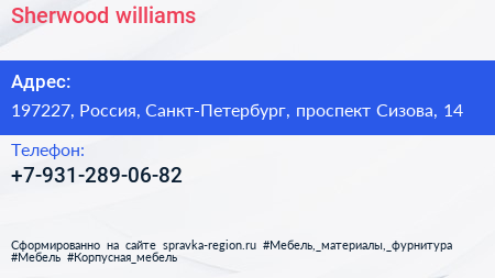 Sherwood williams по адресу 197227, Россия, Санкт-Петербург, проспект Сизова, 14 в дальнейшем Организация, размещена в следующих категориях: