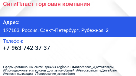 СитиПласт, торговая компания по адресу 197183, Россия, Санкт-Петербург, Рубежная, 2 в дальнейшем Организация, размещена в следующих категориях: