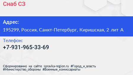 Снаб СЗ по адресу 195299, Россия, Санкт-Петербург, Киришская, 2 лит А в дальнейшем Организация, размещена в следующих категориях:
