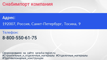 Снабимпорт, компания по адресу 192007, Россия, Санкт-Петербург, Тосина, 9 в дальнейшем Организация, размещена в следующих категориях: