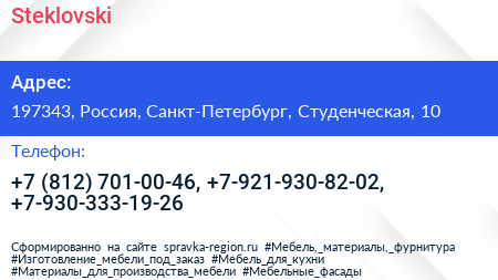 Steklovski по адресу 197343, Россия, Санкт-Петербург, Студенческая, 10 в дальнейшем Организация, размещена в следующих категориях: