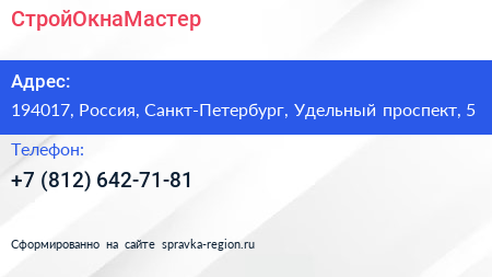 СтройОкнаМастер по адресу 194017, Россия, Санкт-Петербург, Удельный проспект, 5 в дальнейшем Организация, размещена в следующих категориях: