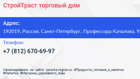 СтройТраст, торговый дом по адресу 192019, Россия, Санкт-Петербург, Профессора Качалова, 9 в дальнейшем Организация, размещена в следующих категориях: