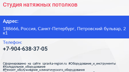 Студия натяжных потолков по адресу 188666, Россия, Санкт-Петербург, Петровский бульвар, 2 к1 в дальнейшем Организация, размещена в следующих категориях: