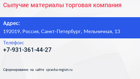 Сыпучие материалы, торговая компания по адресу 192019, Россия, Санкт-Петербург, Мельничная, 13 в дальнейшем Организация, размещена в следующих категориях: