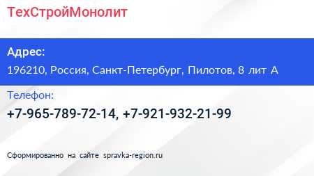 ТехСтройМонолит по адресу 196210, Россия, Санкт-Петербург, Пилотов, 8 лит А в дальнейшем Организация, размещена в следующих категориях: