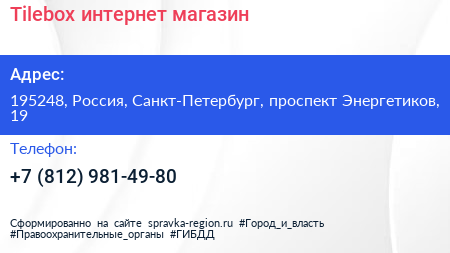 Tilebox, интернет-магазин по адресу 195248, Россия, Санкт-Петербург, проспект Энергетиков, 19 в дальнейшем Организация, размещена в следующих категориях: