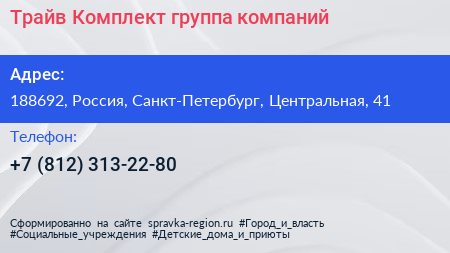 Трайв-Комплект, группа компаний по адресу 188692, Россия, Санкт-Петербург, Центральная, 41 в дальнейшем Организация, размещена в следующих категориях: