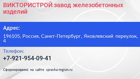 ВИКТОРИСТРОЙ, завод железобетонных изделий по адресу 196105, Россия, Санкт-Петербург, Яковлевский переулок, 4 в дальнейшем Организация, размещена в следующих категориях: