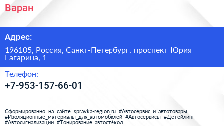 Варан по адресу 196105, Россия, Санкт-Петербург, проспект Юрия Гагарина, 1 в дальнейшем Организация, размещена в следующих категориях:
