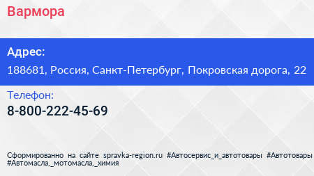 Вармора по адресу 188681, Россия, Санкт-Петербург, Покровская дорога, 22 в дальнейшем Организация, размещена в следующих категориях: