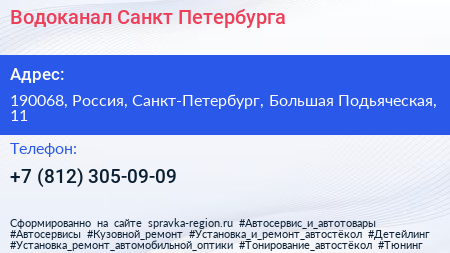 Водоканал Санкт-Петербурга по адресу 190068, Россия, Санкт-Петербург, Большая Подьяческая, 11 в дальнейшем Организация, размещена в следующих категориях: