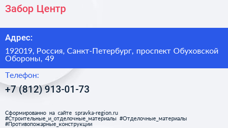 Забор Центр по адресу 192019, Россия, Санкт-Петербург, проспект Обуховской Обороны, 49 в дальнейшем Организация, размещена в следующих категориях: