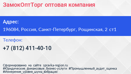 ЗамокОптТорг, оптовая компания по адресу 196084, Россия, Санкт-Петербург, Рощинская, 2 ст1 в дальнейшем Организация, размещена в следующих категориях:
