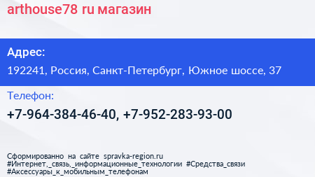 arthouse78.ru, магазин по адресу 192241, Россия, Санкт-Петербург, Южное шоссе, 37 в дальнейшем Организация, размещена в следующих категориях: