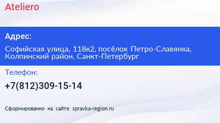 Ateliero по адресу Софийская улица, 118к2, посёлок Петро-Славянка, Колпинский район, Санкт-Петербург в дальнейшем Организация, размещена в следующих категориях: