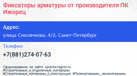 Фиксаторы арматуры от производителя ПК Ижорец по адресу улица Смолячкова, 4/2, Санкт-Петербург в дальнейшем Организация, размещена в следующих категориях: