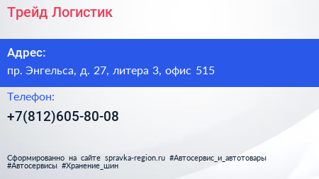 Трейд Логистик по адресу пр. Энгельса, д. 27, литера 3, офис 515 в дальнейшем Организация, размещена в следующих категориях: