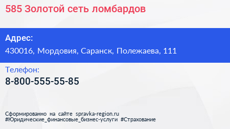585*Золотой, сеть ломбардов по адресу 430016, Мордовия, Саранск, Полежаева, 111 в дальнейшем Организация, размещена в следующих категориях: