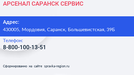 АРСЕНАЛ САРАНСК СЕРВИС по адресу 430005, Мордовия, Саранск, Большевистская, 39Б в дальнейшем Организация, размещена в следующих категориях: