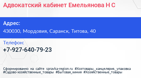 Адвокатский кабинет Емельянова Н.С. по адресу 430030, Мордовия, Саранск, Титова, 40 в дальнейшем Организация, размещена в следующих категориях: