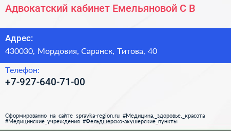 Адвокатский кабинет Емельяновой С.В. по адресу 430030, Мордовия, Саранск, Титова, 40 в дальнейшем Организация, размещена в следующих категориях: