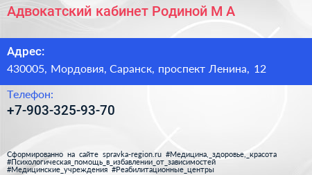 Адвокатский кабинет Родиной М.А. по адресу 430005, Мордовия, Саранск, проспект Ленина, 12 в дальнейшем Организация, размещена в следующих категориях: