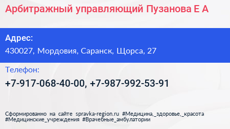 Арбитражный управляющий Пузанова Е.А. по адресу 430027, Мордовия, Саранск, Щорса, 27 в дальнейшем Организация, размещена в следующих категориях: