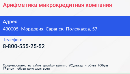 Арифметика, микрокредитная компания по адресу 430005, Мордовия, Саранск, Полежаева, 57 в дальнейшем Организация, размещена в следующих категориях: