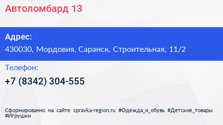 Автоломбард-13 по адресу 430030, Мордовия, Саранск, Строительная, 11/2 в дальнейшем Организация, размещена в следующих категориях:
