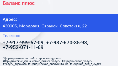 Баланс плюс по адресу 430005, Мордовия, Саранск, Советская, 22 в дальнейшем Организация, размещена в следующих категориях:
