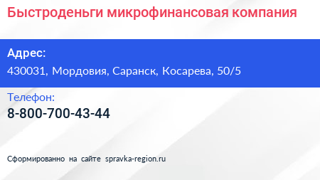 Быстроденьги, микрофинансовая компания по адресу 430031, Мордовия, Саранск, Косарева, 50/5 в дальнейшем Организация, размещена в следующих категориях: