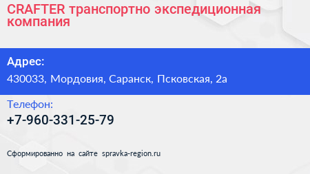 CRAFTER, транспортно-экспедиционная компания по адресу 430033, Мордовия, Саранск, Псковская, 2а в дальнейшем Организация, размещена в следующих категориях: