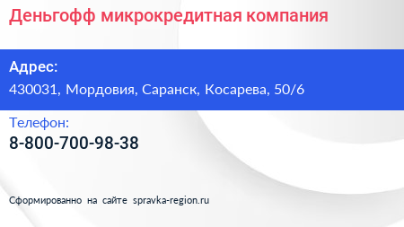 Деньгофф, микрокредитная компания по адресу 430031, Мордовия, Саранск, Косарева, 50/6 в дальнейшем Организация, размещена в следующих категориях: