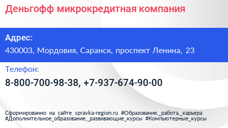 Деньгофф, микрокредитная компания по адресу 430003, Мордовия, Саранск, проспект Ленина, 23 в дальнейшем Организация, размещена в следующих категориях: