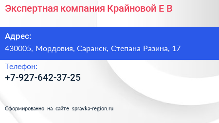 Экспертная компания Крайновой Е.В. по адресу 430005, Мордовия, Саранск, Степана Разина, 17 в дальнейшем Организация, размещена в следующих категориях: