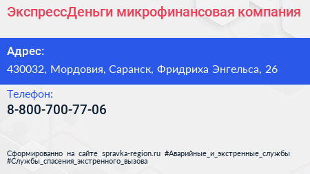 ЭкспрессДеньги, микрофинансовая компания по адресу 430032, Мордовия, Саранск, Фридриха Энгельса, 26 в дальнейшем Организация, размещена в следующих категориях: