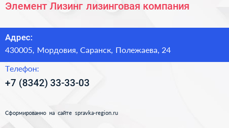 Элемент Лизинг, лизинговая компания по адресу 430005, Мордовия, Саранск, Полежаева, 24 в дальнейшем Организация, размещена в следующих категориях: