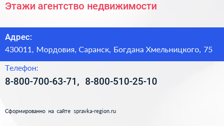 Этажи, агентство недвижимости по адресу 430011, Мордовия, Саранск, Богдана Хмельницкого, 75 в дальнейшем Организация, размещена в следующих категориях: