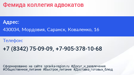 Фемида, коллегия адвокатов по адресу 430034, Мордовия, Саранск, Коваленко, 16 в дальнейшем Организация, размещена в следующих категориях:
