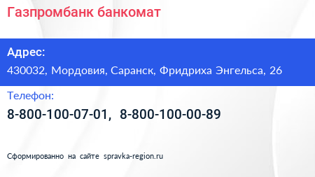 Газпромбанк, банкомат по адресу 430032, Мордовия, Саранск, Фридриха Энгельса, 26 в дальнейшем Организация, размещена в следующих категориях: