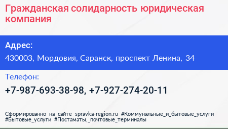 Гражданская солидарность, юридическая компания по адресу 430003, Мордовия, Саранск, проспект Ленина, 34 в дальнейшем Организация, размещена в следующих категориях: