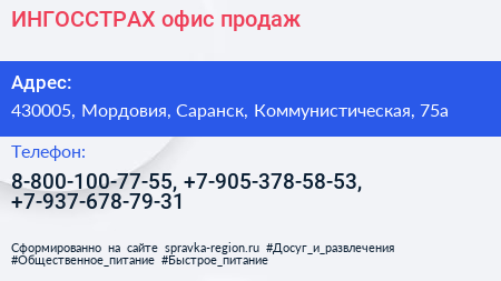 ИНГОССТРАХ, офис продаж по адресу 430005, Мордовия, Саранск, Коммунистическая, 75а в дальнейшем Организация, размещена в следующих категориях: