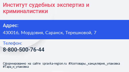 Институт судебных экспертиз и криминалистики по адресу 430016, Мордовия, Саранск, Терешковой, 7 в дальнейшем Организация, размещена в следующих категориях: