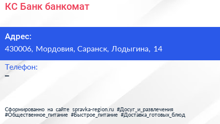 КС Банк, банкомат по адресу 430006, Мордовия, Саранск, Лодыгина, 14 в дальнейшем Организация, размещена в следующих категориях: