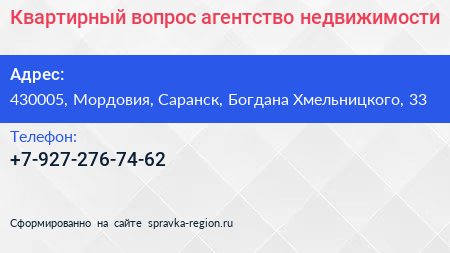 Квартирный вопрос, агентство недвижимости по адресу 430005, Мордовия, Саранск, Богдана Хмельницкого, 33 в дальнейшем Организация, размещена в следующих категориях: