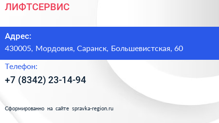 ЛИФТСЕРВИС по адресу 430005, Мордовия, Саранск, Большевистская, 60 в дальнейшем Организация, размещена в следующих категориях: