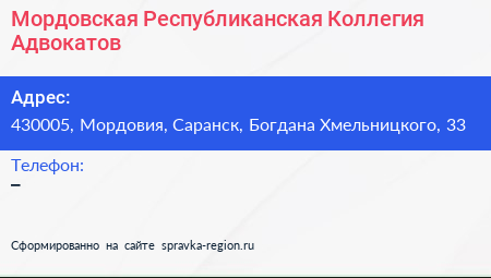 Мордовская Республиканская Коллегия Адвокатов по адресу 430005, Мордовия, Саранск, Богдана Хмельницкого, 33 в дальнейшем Организация, размещена в следующих категориях: