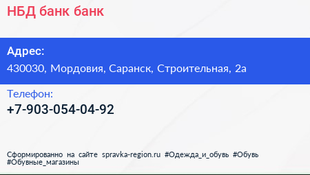 НБД-банк, банк по адресу 430030, Мордовия, Саранск, Строительная, 2а в дальнейшем Организация, размещена в следующих категориях: